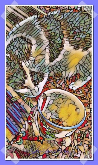Oh I love your artwork, Binky! You look beautiful, like Tiffany glassware! The snails hmm..still undecided!! 😸💕xxx