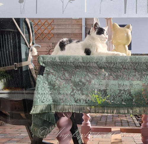 Binky, who’s that white inanimate furiend there with you? It is nice of you to share the table so you can both do dome sun puddlin’. Purr purr purr.