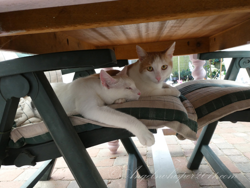 We are so impressed by Granny’s green thumb. Amazing how she is caring so wonderfully for the garden. You two are such good kitties; we are happy the sun finally came up so you can go outside. And how nice that Angel Binky’s scent is still on that carpet. XO