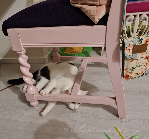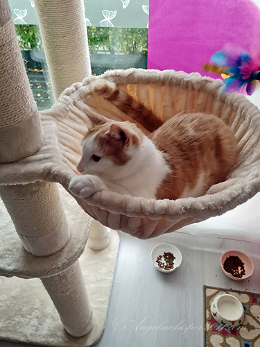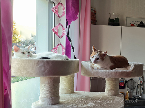 Chaplin: “Catching a toy gives you a real sense of accomplishment, doesn’t it? When I catch mine, I strut all around the house with it and then take it into the cat room to enjoy it.”Oona: “And then Oona takes it away from you.”Chaplin: “…… and then Oona takes it away from me.”
