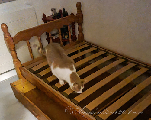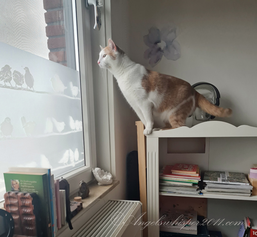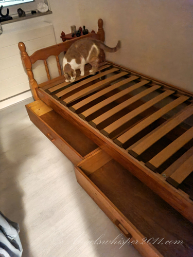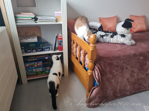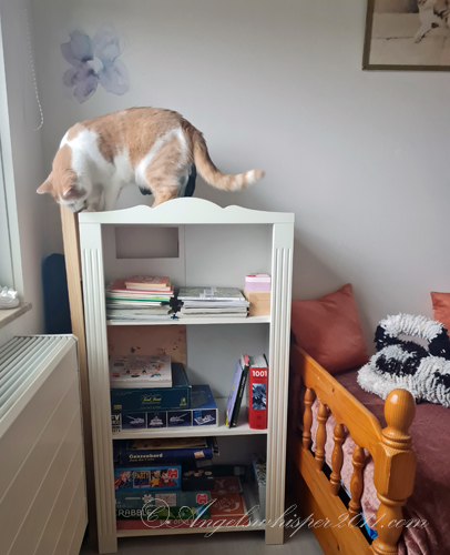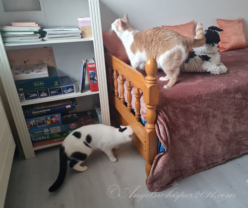 Well boys, that is a wonderful bed for guests but also for YOU! AND you have a new spot on top of the book case so you can spy on the neighbors! YAY!!!!
