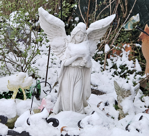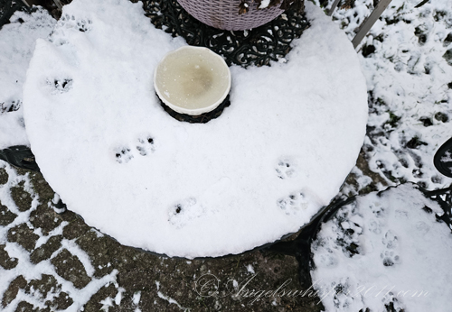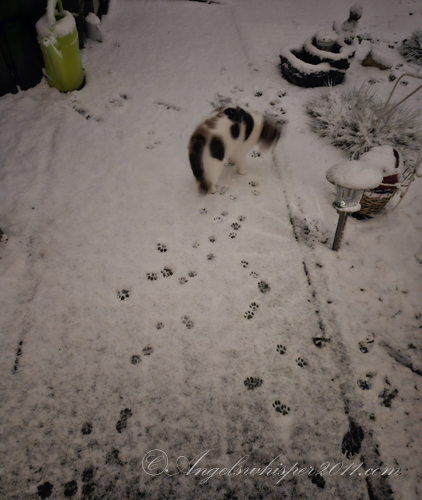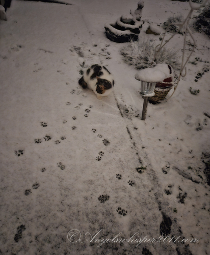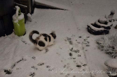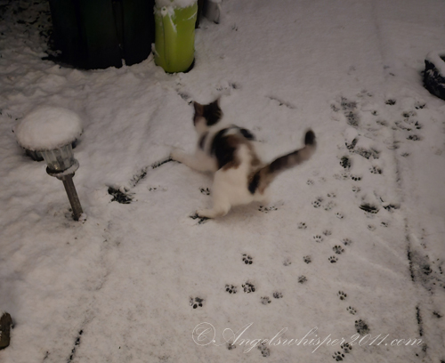 Faye! You’re officially a “snow bunny” now! Looks like you had fun out there but it’s cold on the paws so I imagine when Peachy suggested it was time to come in you were happy to do that. The first snow is exciting though. Love that you got a sign from your Angels…..a white feather for a white Winter full of LOVE ahead!