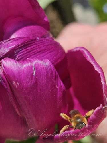 a little bee went inside our still closed tulip…